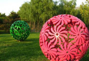 創意粉色鏤空球雕塑,為公園草坪增添童趣