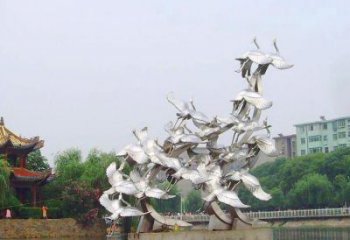 不銹鋼仿銅公園池塘雕塑仙鶴